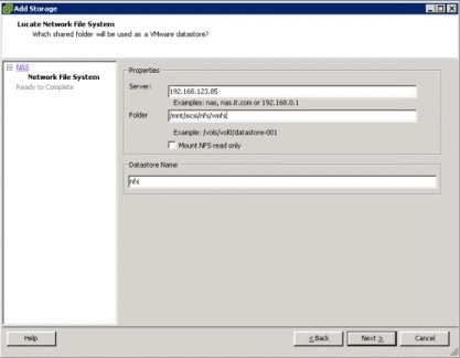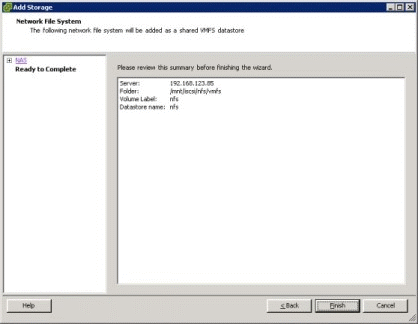 nfs2.gifVoeg het ip- address of dns naam in van je nfs server gevolgd door het voledige pad naam. Als laatste geef je een logische naam aan de nieuwe datastore in mijn geval was dit nfs. klik op finish om de wizard te voltooien.