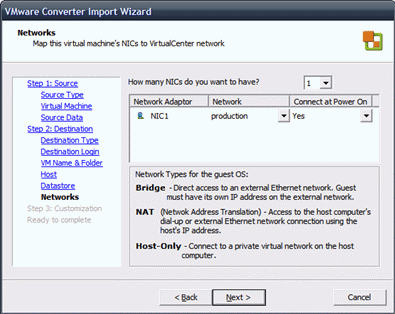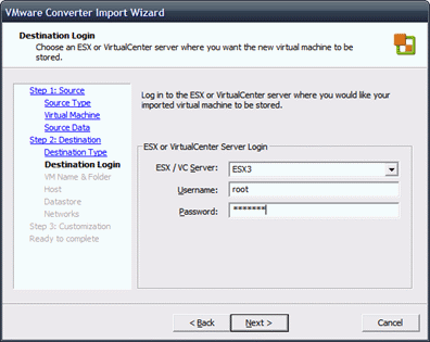 In mijn geval gaan we de virtual machine plaatsen op een ESX3 server. Wil je de virtual machine op een ESX 2.5.x server plaatsen dan heb je een server nodig met VirtualCenter 2 daarop geïnstalleerd.