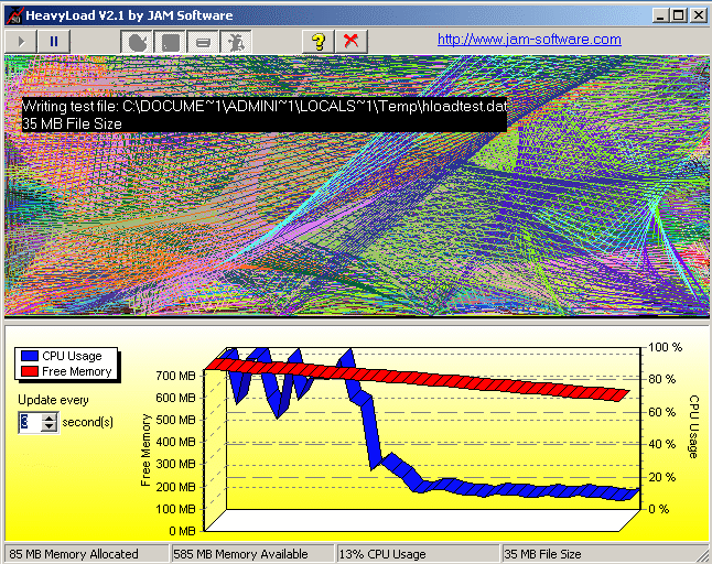Om het effect van Threadmaster te testen heb ik het tooltje Heavyload van JamSoftware gedownload. Deze tool laat de CPU zweten door op 100% te gaan knallen. Zoals je in het onderstaande scherm ziet wordt de CPU daadwerkelijk 100% belast maar na verloop van tijd word de applicatie geknepen naar 25 tot 30 procent.