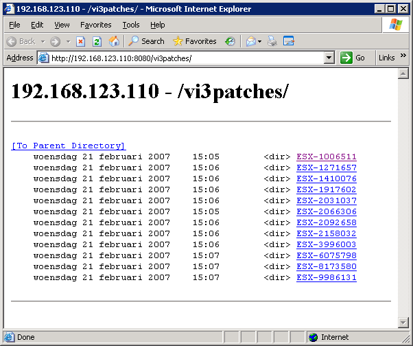 Nu alles is geconfigureerd. Kan de nieuwe repository getest worden. Dit doe je door te browsen naar: http://ipaddressoftheserver/:8080/VI3Patches
