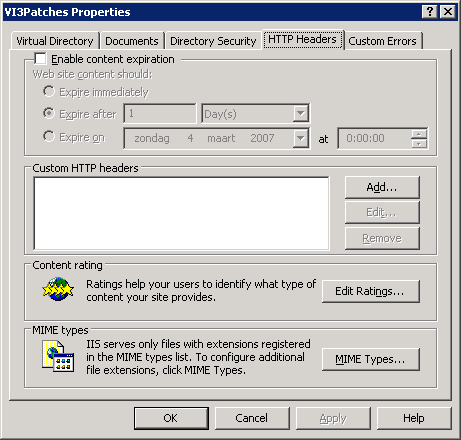 Zo voeg je de nieuwe mime type toe. Vraag de properties op van de Virtual Directory en klik op het tabblad HTTP Headers. Vervolgens klik je op het tabblad MIME Types