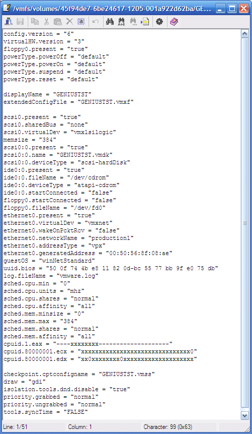 In het onderstaande plaatje zie je de inhoud van het VMX bestand zoals deze nu is op ESX 2.5.x.