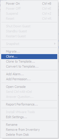 Log in op de VC 2.0.x Server. Sluit de VM die wilt gaan verplaatsen “netjes” af. Vervolgens selecteer je de VM met de rechter muis knop en kies je voor de optie Clone of Migrate als je gebruik wilt maken van DMotion. In dit voorbeeld gaan we aan de slag met de optie Clone. Dit omdat de tijdelijke server die wij gebruiken alleen lokale storage heeft.
