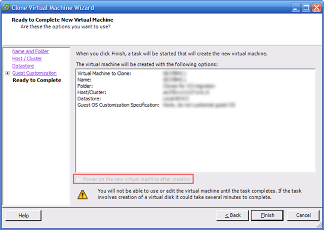 Let erop dat de VM niet automatisch opgestart wordt. Want na de clone operatie upgraden we gelijk de Virtuele Hardware.