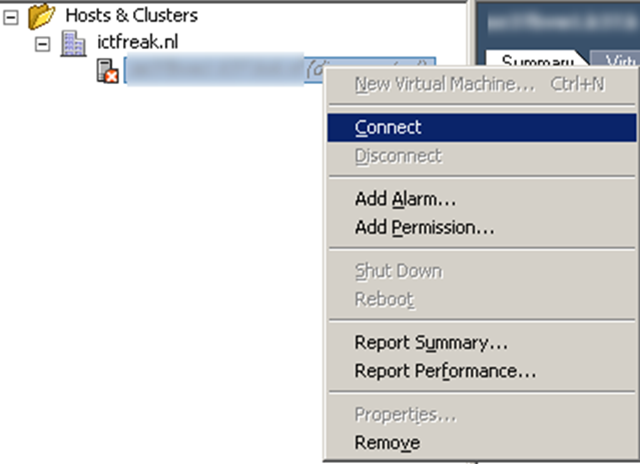 Dit los je als volgt op. Klik met de rechter muisknop op de ESX Server. Daarna kies je Disconnect.