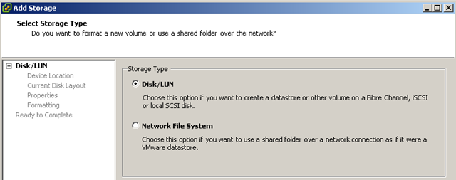 De Add Storage wizard start. Klik op Disk/Lun en klik op next.