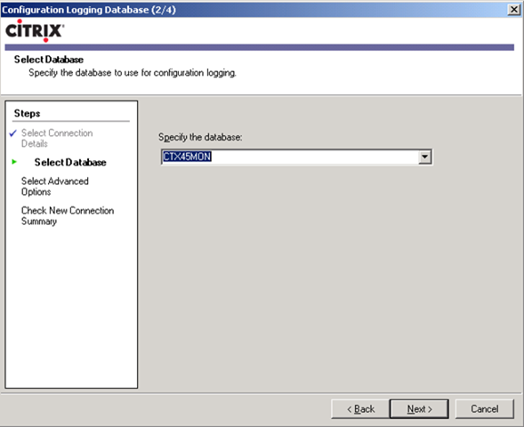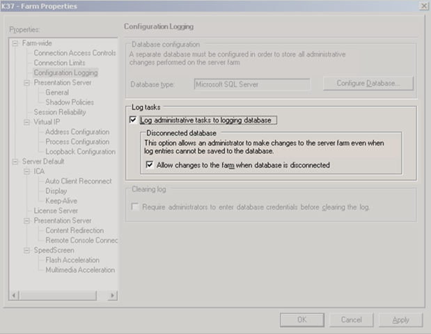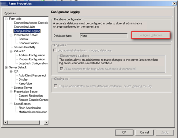 Open de Citrix Access Management console en vraag de properties op van je Farm. Klik vervolgens op Configuration Logging gevolgd door Configure Database.