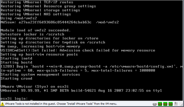 Vanaf nu start de ESX3i machine op zonder de usb-key en met de interactive shell.