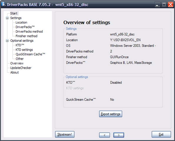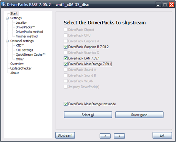 In het settings menu kun je opgeven welke driverpack je wil meenemen.