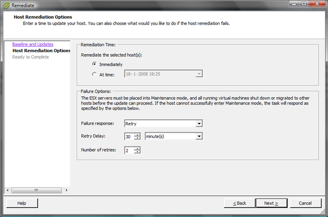 Opmerking: in eerste instantie kreeg ik hier een error en kon ik niet verdergaan. Na een herstart van de VirtualCenter service en de Update Manager service, kon ik wel gebruik maken van de Remediate optie.