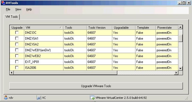 Rob de Veij poste een handige tool op het forum van vmug. De tool heet RVTools en hiermee is het mogelijk om via een ESX server of via een VC server de status van de VMware Tools uit te lezen.