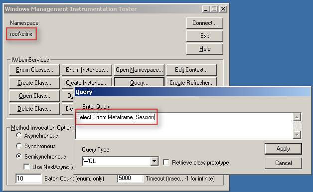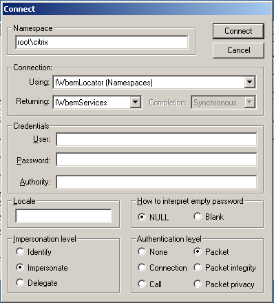 Druk op connect en vul bij de Namespace het volgende in: ‘root\citrix’ en druk op connect.