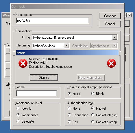 Het kan ook voorkomen dat je een foutmelding krijgt bij het connecten naar de ‘root\citrix’ Namespace. Deze foutmelding treed op als je de WMI Providers niet hebt geïnstalleerd tijdens de installatie van Citrix Presentation Server (XenApp).