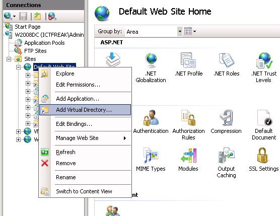open de IIS management Console via Start – Run – inetmgr daarna voeg je een nieuwe Virtual Directory toe.