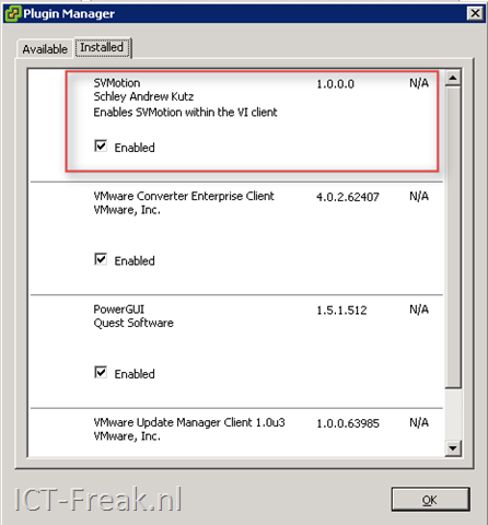 Sinds ESX 3.5 bestaat de feature Storage VMotion. Deze feature stelt je in staat een actieve VM te verplaatsen naar een andere datastore zonder downtime. Ik was nog niet in de gelegenheid geweest om deze feature te testen. In het begin kon je een Storage VMotion alleen uitvoeren  via de remote cli (deze kun je hier downloaden: http://vmware.com/download/vi/drivers_tools.html) of je kunt gebruik maken van de VIMA. Bij deze twee opties moet je de Storage VMotion taak uitvoeren van de commandline. Gelukkig zijn er altijd nog gasten die kunnen programmeren. Zo ook Andrew Kutz. Hij heeft de Storage VMotion plugin voor VIC gemaakt. Meer informatie en de download vind je hier: http://sourceforge.net/projects/vip-svmotion/.