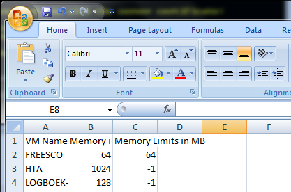 I wanted to see how the memory limits are configured in my VI3 environment. You can do this via the VIC, but you can also do it via a PowerCLI script and export it to a csv file.