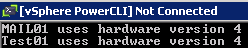 Get-VM |% {Get-View $_.ID} |` % { $vmVersion = $_.Config.Version $vmName = $_.Name if ($vmVersion -eq "vmx-04"){ Write-Host $vmName "uses hardware version 4" } } Disconnect-VIServer -Confirm:$false