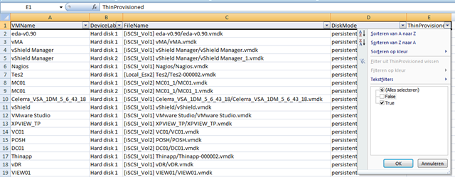 When the script is finished, you can import the CSV file into Excel. After the import, we can analyze the data with just a simple filter. With a few clicks, you’re able to view al the VM’s without Thin Provisioned disks.
