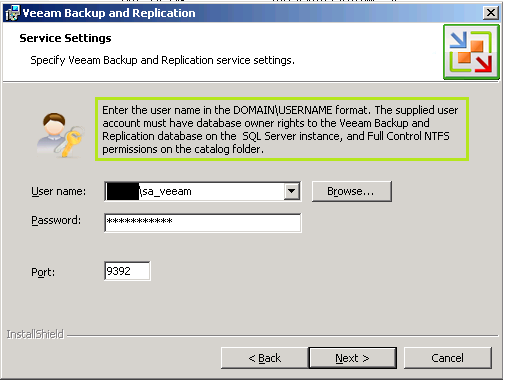 Service Settings: Enter a user with the appropriate permissions on the Server (NTFS) and the Database. I wanted to use a service account but it’s not possible during setup. If you want use a service account you must create the VBRCatalog dir and set the right permissions on the database. The last step is impossible because the database will be generated and populated during the setup. So I used the Administrator account during the setup. I changed the account right after the setup.image