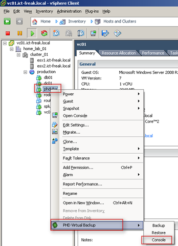 From the vSphere client, you can start the PHD Virtual Backup Console via right click on the phdvba VM or any other object from the vSphere client –> PHD Virtual Backup –> Console.
