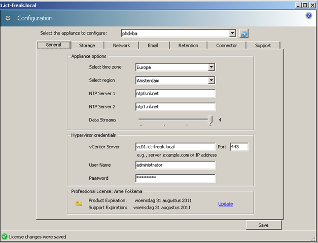 - I will show you some of the settings. I’ll start with the general settings. You can configure the time zone, region and NTP servers. You can also configure the Hypervisor credentials. This can be a single vSphere host or a vCenter server instance. The last setting in the general section is the license key. You can upload you license file here.