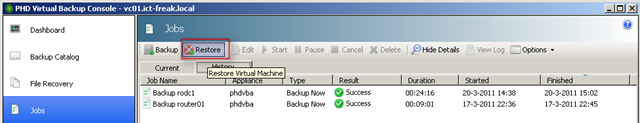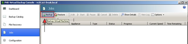 To restore a complete VM, you have to open the PHD Virtual Backup Console. Go to Jobs and select Restore: