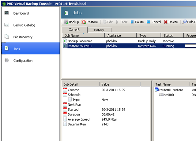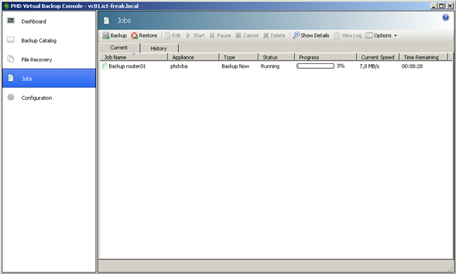 The Job is started and you can monitor the Job from the Jobs view in the PHD Virtual Backup Console: