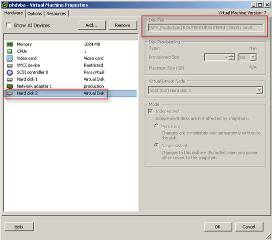 The phdvba appliance takes a snapshot of the router01 VM and mounts the Delta-disk to the Appliance. You can verify this by opening the Hardware configuration of the phdvba appliance: