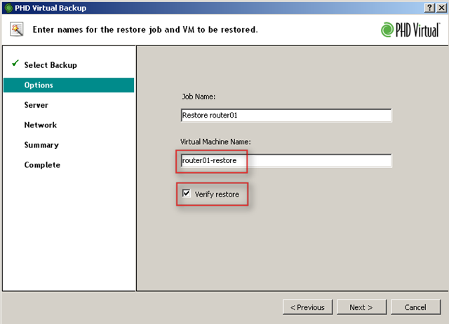 If you restore the VM while the production VM still exist, make sure you rename the Virtual Machine Name and select verify restore if you want to verify the job.