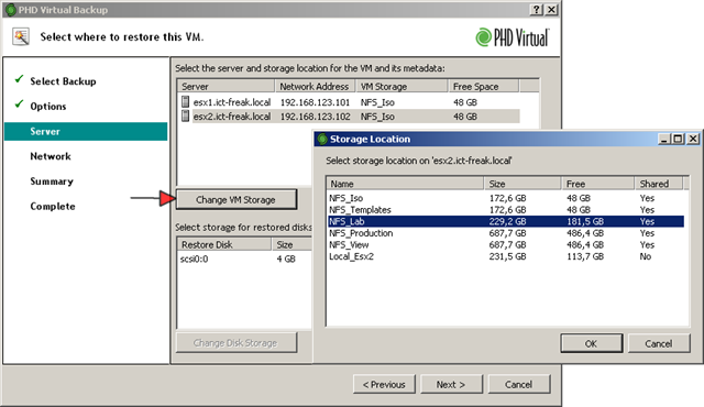 Select the destination server and if the default selected VM Storage isn’t the storage you want to use for the restore, you can click on Change VM Storage to select the right storage. In my case I selected the NFS_Lab NFS Share.