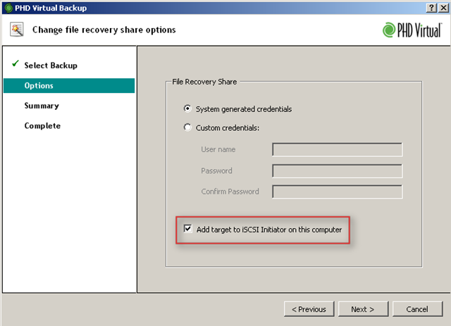 PHD uses the iSCSI protocol to mount the Backup file on a Windows or Linux VM. If you’re are running a Windows version prior to Windows 2008 or Windows 7, you have to install the iSCSI Software initiator. You can download the latest version here.