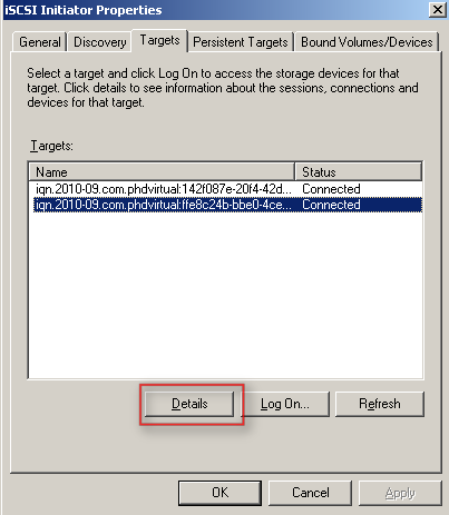 You have to open the iSCSI Initiator (this can be done via the Tools button from the PHD console). Open the Targets tab and select the target you want to disconnect. Click on Details to see the rest of the settings.