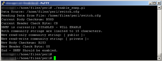 $ ./enable_snmp.pl <SWITCH IP> Obtaining data from Switch: <SWITCH IP> Administrator Username: [ admin ]: <USER> Administrator Password: [ admin ]: <PASSWORD> Current Body Checksum: <SOME HEXADECIMAL VALUE> Current Header Check Byte: <SOME HEXADECIMAL VALUE> SNMP is currently: DISABLED - WILL ENABLE Both community strings are limited to 15 characters. New read-only community string: [ public ]: <STRING RO> New read-write community string: [ private ]: <STRING RW> New Body Checksum: <SOME HEXADECIMAL VALUE> New Header Check Byte: <SOME HEXADECIMAL VALUE> End - SNMP Should be enabled.