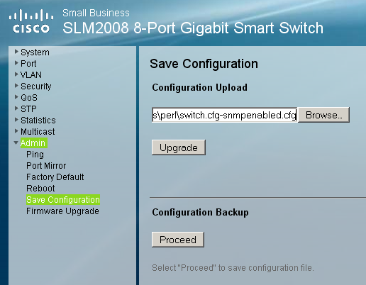 The next step is to restore the changed config to the SLM2008 switch. Open the GUI and upgrade the configuration with the new “snmpenabled” config via Admin – Save configuration – Upgrade: