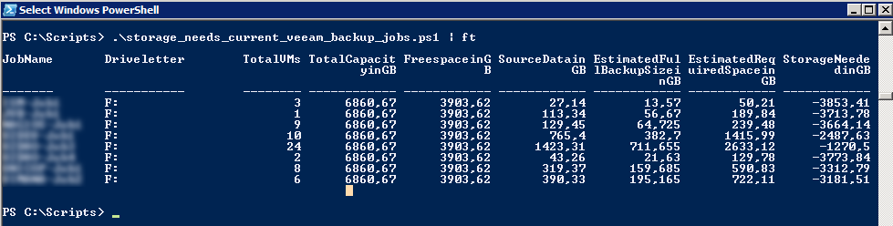 if((Get-PSSnapin -Name VeeamPSSnapIn -ErrorAction SilentlyContinue) -eq $null){ Add-PSSnapin "VeeamPSSnapIn" } $DestinationStorage = @() foreach($vbrjob in (Get-VBRJob | Sort Name)){ $Details = "" | Select JobName, Driveletter, TotalVMs, TotalCapacityinGB, FreespaceinGB, SourceDatainGB, EstimatedFullBackupSizeinGB, EstimatedRequiredSpaceinGB, StorageNeededinGB $diskinfo = Get-WmiObject Win32_logicaldisk $options = $vbrjob.GetOptions() $avgcr = "50" $numFull = $options.FullBackupFrequency $retaincycles = $options.RetainCycles $avgdiskchanges = "5" $driveLetter = $vbrJob.Info.TargetDir.Split("\")[0] $partition = $diskinfo | Where {$_.DeviceID -eq $driveLetter} $TotalCapacity = [math]::round($partition.Size / 1GB, 2) $FreeSpace = [math]::round($partition.FreeSpace / 1GB, 2) $JobSize = [math]::round($vbrjob.Info.IncludedSize / 1GB, 2) #TotalSize in Veeam Console $FullBackupSize = $jobSize / 2 $JobMath = "{0:P0}" -f $avgcr / 100 * ($numFull * $JobSize + $retaincycles * ("{0:P0}" -f $avgdiskchanges / 100 * $JobSize)) $JobMath2 = [math]::round($JobMath, 2) $Details.JobName = $vbrjob.Name $Details.Driveletter = $driveLetter $Details.TotalVMs = ($vbrJob.GetObjectsInJob()).Count $Details.TotalCapacityinGB = $TotalCapacity $Details.FreespaceinGB = $FreeSpace $Details.SourceDatainGB = $JobSize $Details.EstimatedFullBackupSizeinGB = $FullBackupSize $Details.EstimatedRequiredSpaceinGB = $JobMath2 + $JobSize $Details.StorageNeededinGB = ($JobMath2 + $JobSize) - $FreeSpace $DestinationStorage += $Details } $DestinationStorage