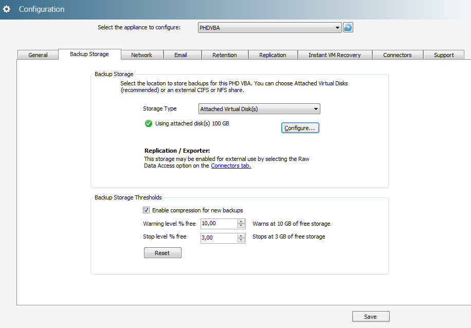 PHD Virtual Backup can use storage available via the hypervisor (iSCSI, Fibre Channel) or network storage (CIFS or NFS) to store backup data. When you deploy a PHD VBA, you configure the backup storage by either adding one or more virtual disks to the PHD VBA virtual machine or by specifying a network storage location (either an NFS or CIFS share). When using attached disks, they can be created on local or shared hypervisor storage. Virtual disks attached to the PHD VBA is the recommended method for storing your backup data with PHD Virtual Backup.