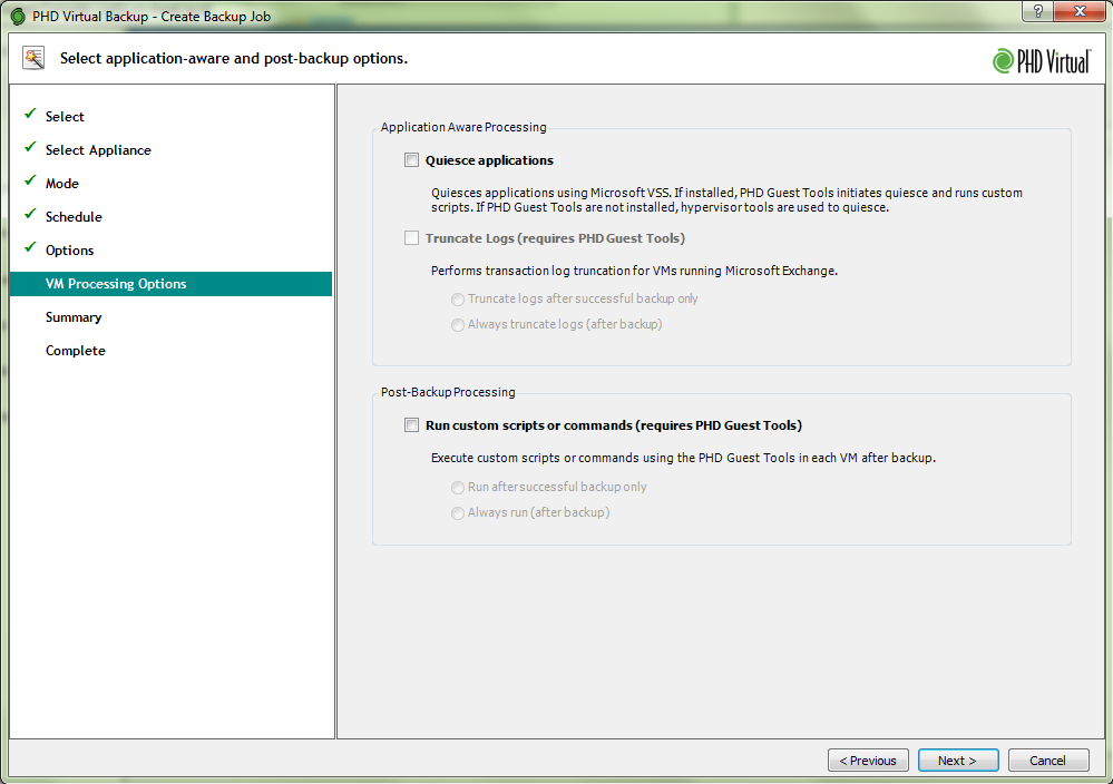 You can also select the Application Aware Processing options and Post-Backup Processing options. You need to install the PHD Guest Tools and VMware Tools inside the Guest OS of your VMs.