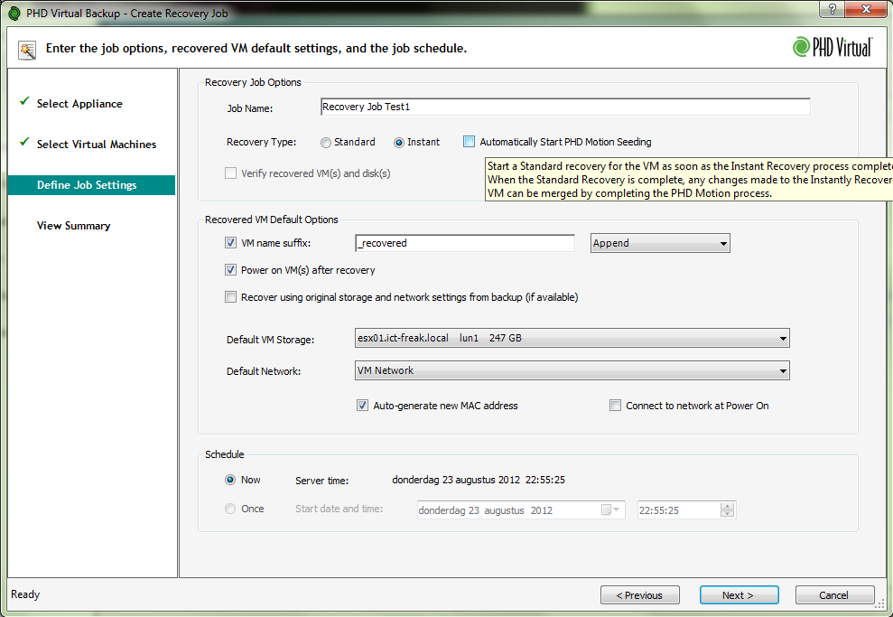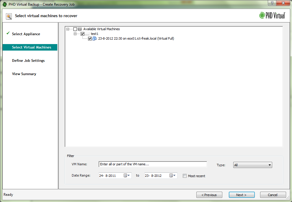 You can start a recovery job from the PHD Virtual Backup Console or via the Plugin inside the vSphere client: