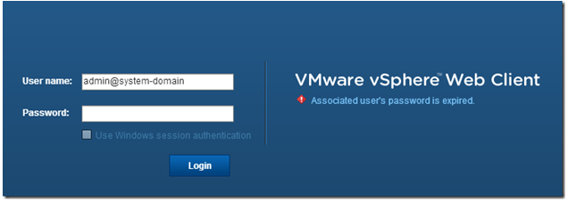 The first thing I thought was a typo when entering the password for the SSO Admin user. But after three times I stll got the same error. So the next step was logging into the vSphere web-client as admin@system-domain. But I was unable to logon because the associated user’s password is expired. That explains a lot.