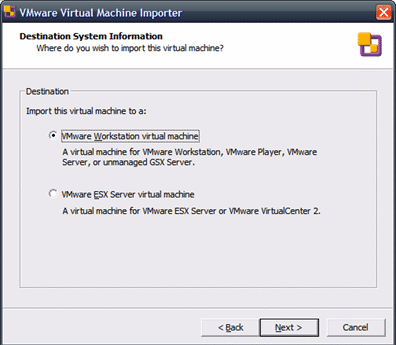 In mijn geval gaan we de virtual machine plaatsen op een ESX3 server. Wil je de virtual machine op een ESX 2.5.x server plaatsen dan heb je een server nodig met VirtualCenter 2 daarop geïnstalleerd.