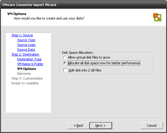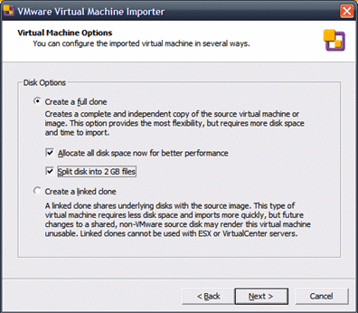 Selecteer de optie “Create a full clone” met daarbij de opties “Allocate all disk space now for better perofrmance en Split disk into 2 GB files“.