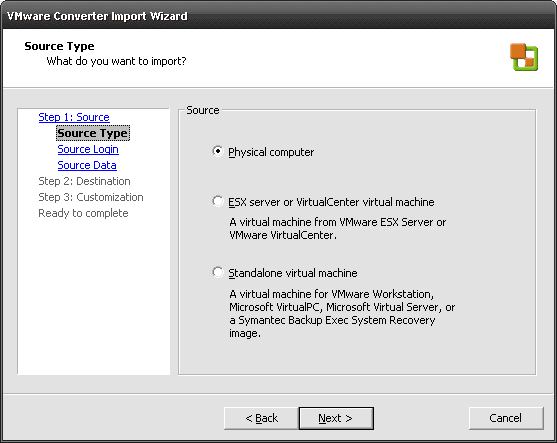 Start de VMware Converter Import wizard en kies voor de optie Physical computer