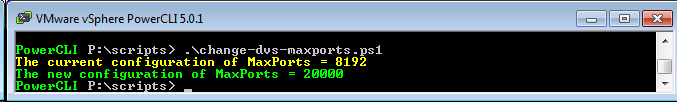 $dvSwitchName = "dvSwitchName" $dvSwitch = Get-VirtualSwitch -Distributed -Name $dvSwitchName if($dvSwitch.ExtensionData.Config.ProductInfo.Version –notmatch "4.*"){ foreach($dvPG in (Get-View -ViewType DistributedVirtualPortgroup|?{!($_.Tag|?{$_.Key -eq "SYSTEM/DVS.UPLINKPG"}) -and !$_.Config.autoExpand})){ $spec = New-Object VMware.Vim.DVPortgroupConfigSpec $spec.AutoExpand = "True" $spec.ConfigVersion = $dvPG.Config.ConfigVersion $dvPG.ReconfigureDVPortgroup_Task($spec) Write-Host "Enable auotExpand for dvPortgroup: $($dvPG.Name)" -ForegroundColor Yellow $dvPG.UpdateViewData() } } else{ Write-Host "dvSwitch: $($dvSwitch.Name) is not configured with version 5 or higher. Please upgrade.." -ForegroundColor Red }