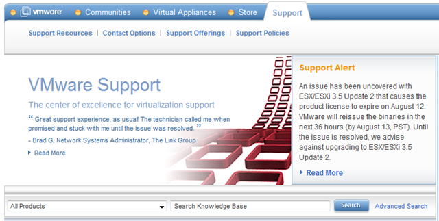 – A Knowledgebase article has been published (http://kb.vmware.com/kb/1006716), but traffic to the knowledgebase is causing time outs. A new static page has been published at http://www.vmware.com/support/esx35u2_supportalert.html that customers and partners will be able to view.
