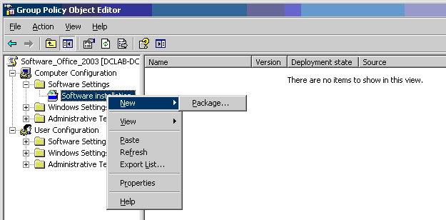 Klik rechts op de Software installation node. Vervolgens klik je op New Package