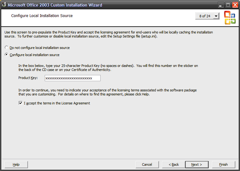 In dit scherm kun je de CD-Key invoeren en de License Agreement accepteren. Als je deze settings aanzet hoef je tijdens het installeren of bij de eerste keer starten van Office applicaties niet meer de CD-Key in te voeren.