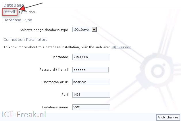 Click on Database to configure your database. Configure the Database connection settings and press install database. Click on Apply changes.