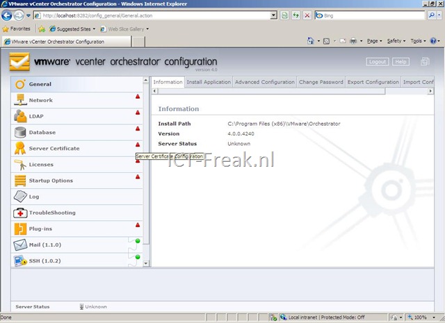 When the installation is finished, open Services.msc and check if the vCenter VMware vCenter Orchestrator Configuration is started. If this is not the case, set the service to start automatic and start the service. When the vCenter Orchestrator Configuration service is started, Start the vCenter Orchestrator Web Configuration service.