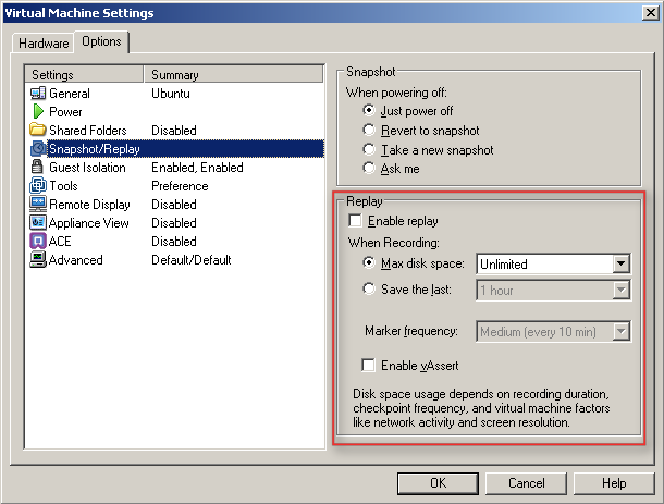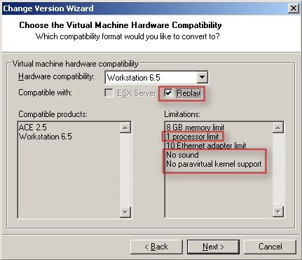 Voor de replay functie dien je wel de Hardware compatibility te verhogen naar Workstation 6.5.